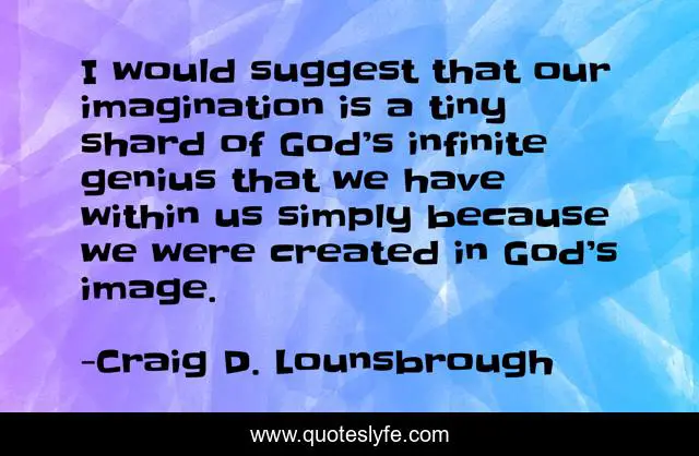 This page presents the quote "I would suggest that our imagination is a tiny shard of God’s infinite genius that we have within us simply because we were created in God’s image.". Author of this quote is Craig D. Lounsbrough. .