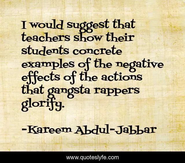 This page presents the quote "I would suggest that teachers show their students concrete examples of the negative effects of the actions that gangsta rappers glorify.". Author of this quote is Kareem Abdul-Jabbar. This quote is about students, negative, teachers,.