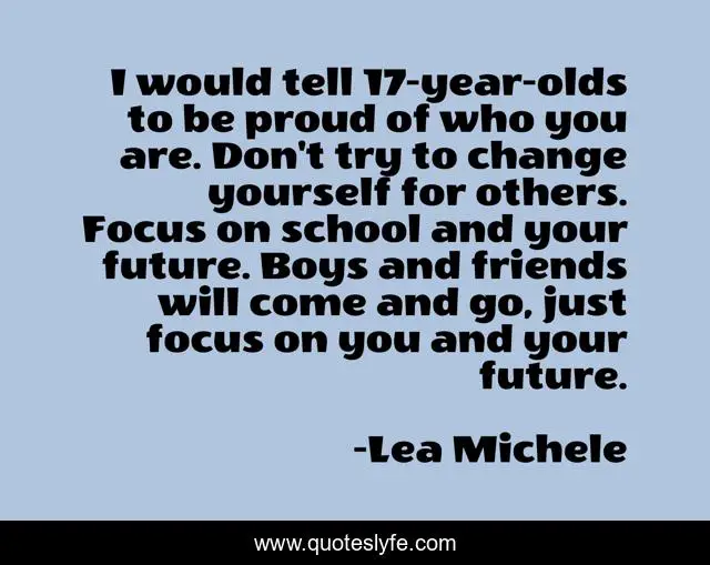 This page presents the quote "I would tell 17-year-olds to be proud of who you are. Don't try to change yourself for others. Focus on school and your future. Boys and friends will come and go, just focus on you and your future.". Author of this quote is Lea Michele. This quote is about school, future, friends,.