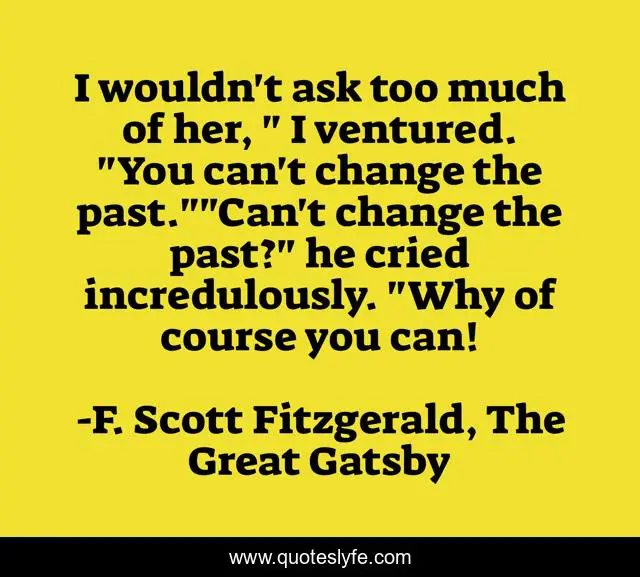 This page presents the quote "I wouldn't ask too much of her, " I ventured. "You can't change the past.""Can't change the past?" he cried incredulously. "Why of course you can!". Author of this quote is F. Scott Fitzgerald, The Great Gatsby. This quote is about past, change, gatsby,.