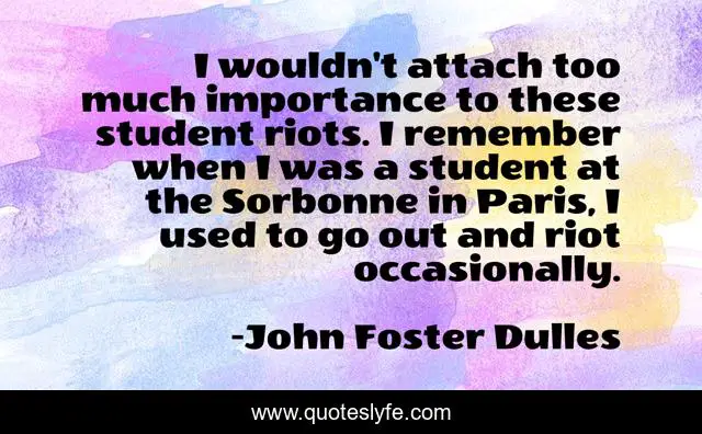 This page presents the quote "I wouldn't attach too much importance to these student riots. I remember when I was a student at the Sorbonne in Paris, I used to go out and riot occasionally.". Author of this quote is John Foster Dulles. This quote is about paris, remember, student,.