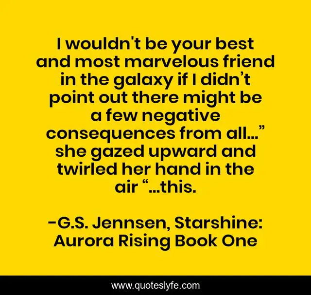 This page presents the quote "I wouldn't be your best and most marvelous friend in the galaxy if I didn’t point out there might be a few negative consequences from all…” she gazed upward and twirled her hand in the air “…this.". Author of this quote is G.S. Jennsen, Starshine: Aurora Rising Book One. This quote is about kennedy-rossi, space-opera, science-fiction, adventure, science-fiction-romance,.