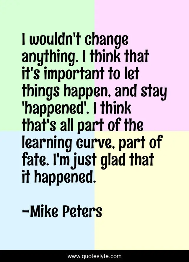 This page presents the quote "I wouldn't change anything. I think that it's important to let things happen, and stay 'happened'. I think that's all part of the learning curve, part of fate. I'm just glad that it happened.". Author of this quote is Mike Peters. This quote is about change, fate, think,.