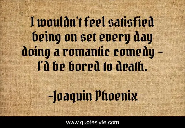 This page presents the quote "I wouldn't feel satisfied being on set every day doing a romantic comedy - I'd be bored to death.". Author of this quote is Joaquin Phoenix. This quote is about every day, death, day,.