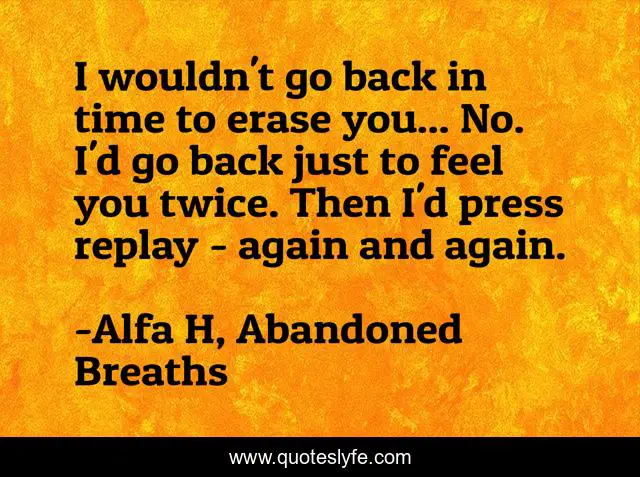 This page presents the quote "I wouldn't go back in time to erase you... No. I'd go back just to feel you twice. Then I'd press replay - again and again.". Author of this quote is Alfa H, Abandoned Breaths. This quote is about relationships, life, love, poetry, affection,.