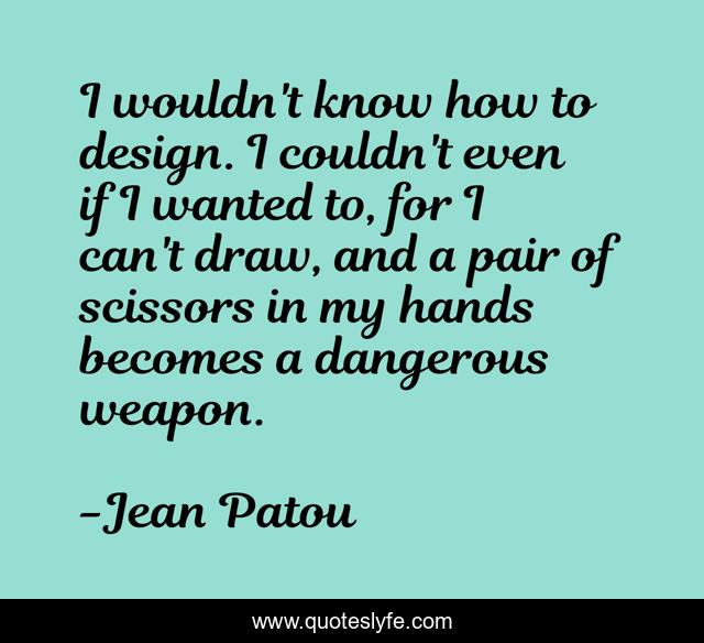 This page presents the quote "I wouldn't know how to design. I couldn't even if I wanted to, for I can't draw, and a pair of scissors in my hands becomes a dangerous weapon.". Author of this quote is Jean Patou. This quote is about dangerous, hands,.