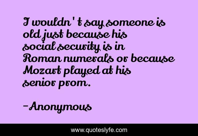 This page presents the quote "I wouldn't say someone is old just because his social security is in Roman numerals or because Mozart played at his senior prom.". Author of this quote is Anonymous. This quote is about age, birthdays,.