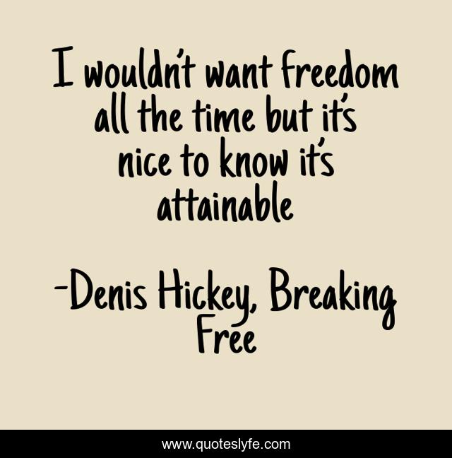 This page presents the quote "I wouldn’t want freedom all the time but it’s nice to know it’s attainable". Author of this quote is Denis Hickey, Breaking Free. This quote is about freedom, life-and-living, philosophy,.