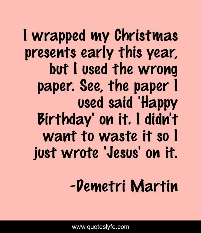 This page presents the quote "I wrapped my Christmas presents early this year, but I used the wrong paper. See, the paper I used said 'Happy Birthday' on it. I didn't want to waste it so I just wrote 'Jesus' on it.". Author of this quote is Demetri Martin. This quote is about birthday, happy,.