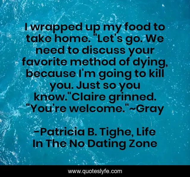 This page presents the quote "I wrapped up my food to take home. "Let's go. We need to discuss your favorite method of dying, because I'm going to kill you. Just so you know."Claire grinned. "You're welcome."~Gray". Author of this quote is Patricia B. Tighe, Life In The No Dating Zone. This quote is about young-adult, young-adult-romance,.
