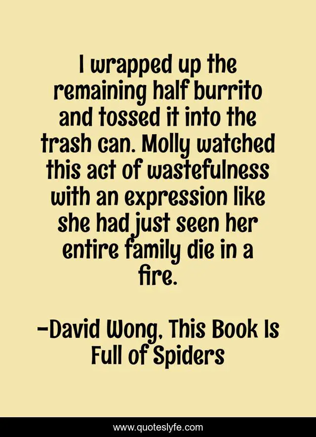 This page presents the quote "I wrapped up the remaining half burrito and tossed it into the trash can. Molly watched this act of wastefulness with an expression like she had just seen her entire family die in a fire.". Author of this quote is David Wong, This Book Is Full of Spiders. This quote is about david-wong, dogs, burritos, molly-the-dog, wastefulness, tragedy,.