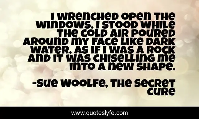 This page presents the quote "I wrenched open the windows. I stood while the cold air poured around my face like dark water, as if I was a rock and it was chiselling me into a new shape.". Author of this quote is Sue Woolfe, The Secret Cure. .