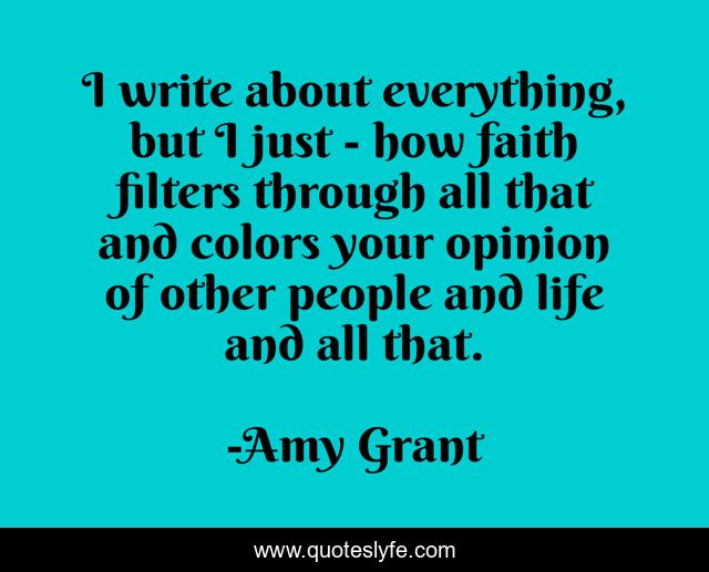 This page presents the quote "I write about everything, but I just - how faith filters through all that and colors your opinion of other people and life and all that.". Author of this quote is Amy Grant. This quote is about life, colors, people,.