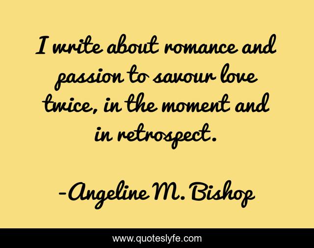 This page presents the quote "I write about romance and passion to savour love twice, in the moment and in retrospect.". Author of this quote is Angeline M. Bishop. This quote is about love, reflection, novels, writing, romance, writers, passion, affection,.
