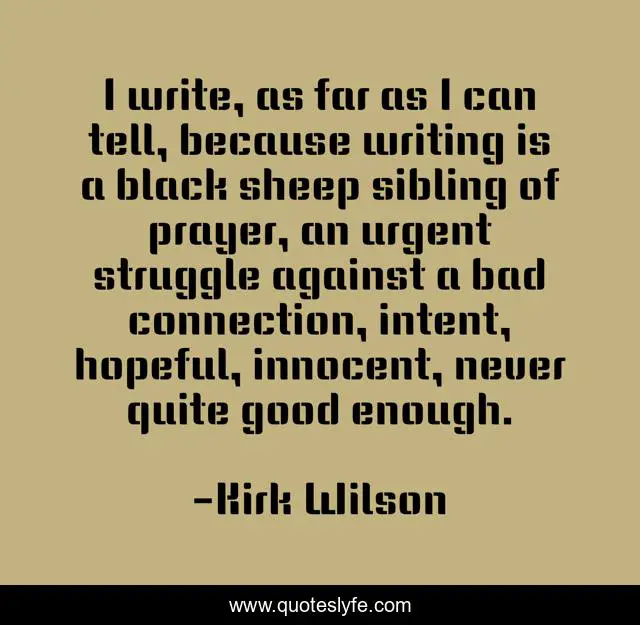 This page presents the quote "I write, as far as I can tell, because writing is a black sheep sibling of prayer, an urgent struggle against a bad connection, intent, hopeful, innocent, never quite good enough.". Author of this quote is Kirk Wilson. This quote is about prayer, writing,.