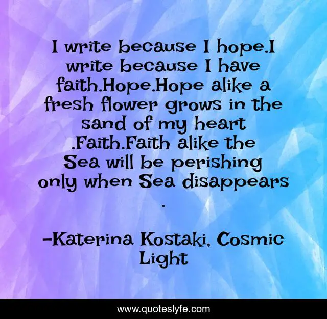 This page presents the quote "I write because I hope.I write because I have faith.Hope.Hope alike a fresh flower grows in the sand of my heart .Faith.Faith alike the Sea will be perishing only when Sea disappears .". Author of this quote is Katerina Kostaki, Cosmic Light. This quote is about spirituality, spiritual-wisdom,.