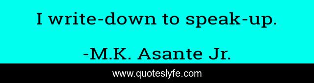 This page presents the quote "I write-down to speak-up.". Author of this quote is M.K. Asante Jr.. This quote is about belief, speaking, writing,.