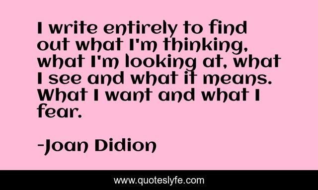 This page presents the quote "I write entirely to find out what I'm thinking, what I'm looking at, what I see and what it means. What I want and what I fear.". Author of this quote is Joan Didion. .