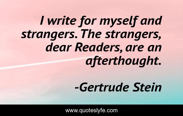 This page presents the quote "I write for myself and strangers. The strangers, dear Readers, are an afterthought.". Author of this quote is Gertrude Stein. This quote is about writers-on-writing, writers, writing,.
