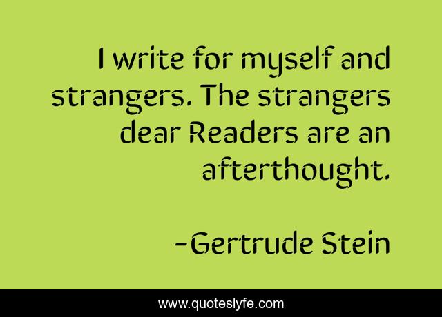 This page presents the quote "I write for myself and strangers. The strangers dear Readers are an afterthought.". Author of this quote is Gertrude Stein. This quote is about writers, writing,.