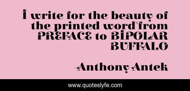 This page presents the quote "I write for the beauty of the printed word"from PREFACE to BIPOLAR BUFFALO". Author of this quote is Anthony Antek. This quote is about relationships, literature, humor, social-science,.