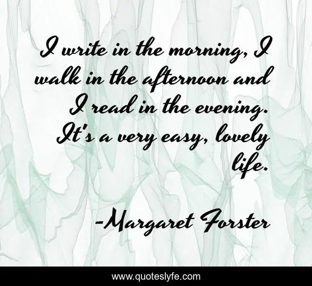 This page presents the quote "I write in the morning, I walk in the afternoon and I read in the evening. It's a very easy, lovely life.". Author of this quote is Margaret Forster. This quote is about life, easy, walk,.