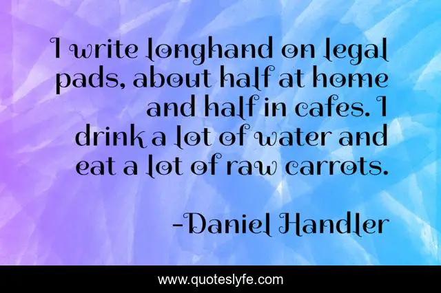 This page presents the quote "I write longhand on legal pads, about half at home and half in cafes. I drink a lot of water and eat a lot of raw carrots.". Author of this quote is Daniel Handler. This quote is about water, home, drink,.