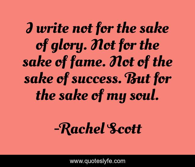 This page presents the quote "I write not for the sake of glory. Not for the sake of fame. Not of the sake of success. But for the sake of my soul.". Author of this quote is Rachel Scott. This quote is about christian, columbine, success, soul, writing, glory, martyr, fame,.
