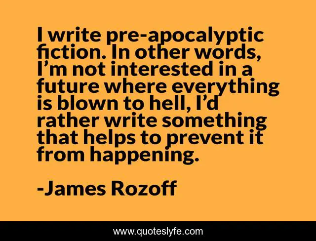 This page presents the quote "I write pre-apocalyptic fiction. In other words, I’m not interested in a future where everything is blown to hell, I’d rather write something that helps to prevent it from happening.". Author of this quote is James Rozoff. This quote is about post-apocalyptic, fiction,.