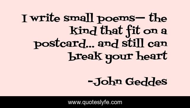 This page presents the quote "I write small poems— the kind that fit on a postcard… and still can break your heart". Author of this quote is John Geddes. This quote is about poems, loneliness, heartbreak,.