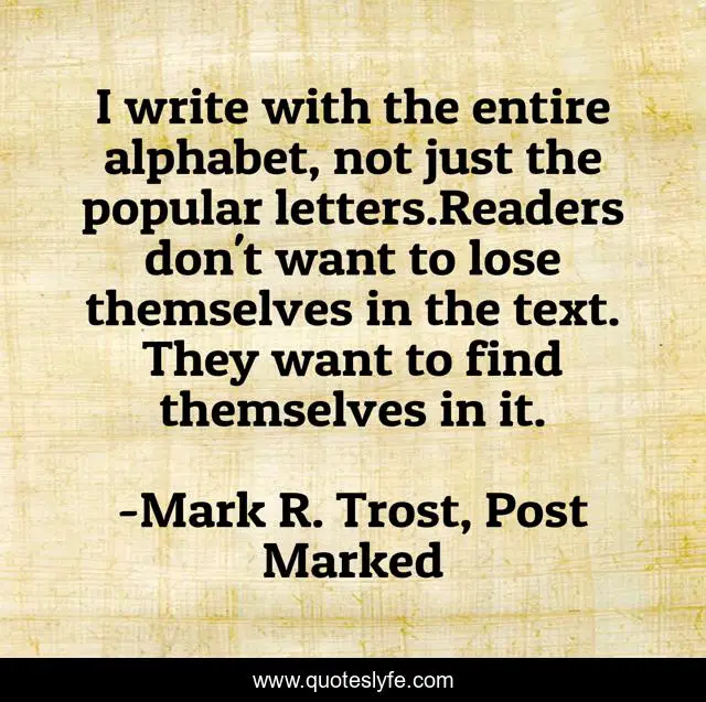 This page presents the quote "I write with the entire alphabet, not just the popular letters.Readers don't want to lose themselves in the text. They want to find themselves in it.". Author of this quote is Mark R. Trost, Post Marked. This quote is about relationships, roman-catholic-church, theology,.