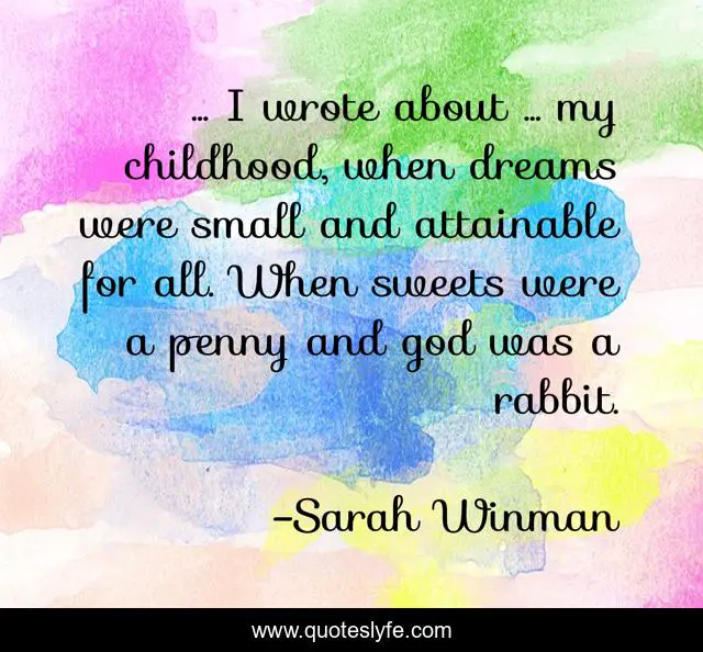 This page presents the quote "... I wrote about ... my childhood, when dreams were small and attainable for all. When sweets were a penny and god was a rabbit.". Author of this quote is Sarah Winman. This quote is about childhood, life-lessons, growing-up,.