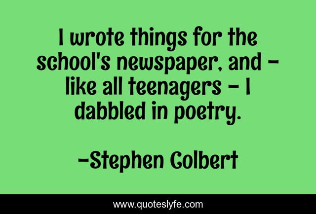 This page presents the quote "I wrote things for the school's newspaper, and - like all teenagers - I dabbled in poetry.". Author of this quote is Stephen Colbert. This quote is about newspaper, school, teenagers,.