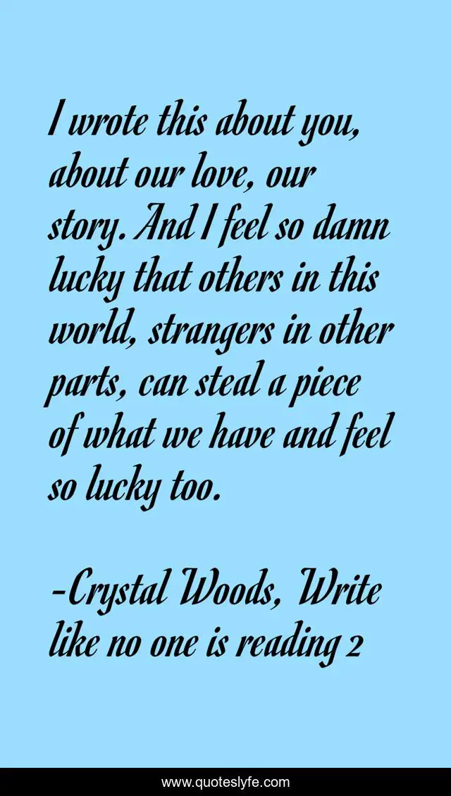 This page presents the quote "I wrote this about you, about our love, our story. And I feel so damn lucky that others in this world, strangers in other parts, can steal a piece of what we have and feel so lucky too.". Author of this quote is Crystal Woods, Write like no one is reading 2. This quote is about relationships, romance, love, romantic, about-you, fairytale, lucky, our-love, strangers,.