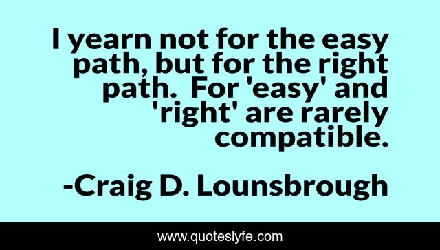 This page presents the quote "I yearn not for the easy path, but for the right path. For 'easy' and 'right' are rarely compatible.". Author of this quote is Craig D. Lounsbrough. This quote is about right, challenging, hard, mission, obstacle, incompatible, destination, easy, tenacity,.