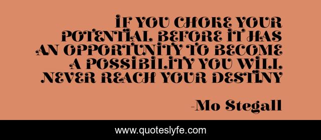 This page presents the quote "IF YOU CHOKE YOUR POTENTIAL BEFORE IT HAS AN OPPORTUNITY TO BECOME A POSSIBILITY YOU WILL NEVER REACH YOUR DESTINY". Author of this quote is Mo Stegall. This quote is about empowerment, self-confidence, personal-growth, inspirational, self-help, enthusiasm,.