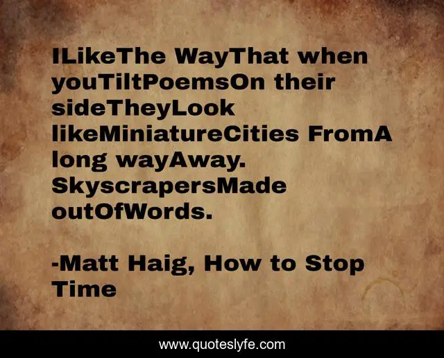 This page presents the quote "ILikeThe WayThat when youTiltPoemsOn their sideTheyLook likeMiniatureCities FromA long wayAway. SkyscrapersMade outOfWords.". Author of this quote is Matt Haig, How to Stop Time. This quote is about poem, poetry,.