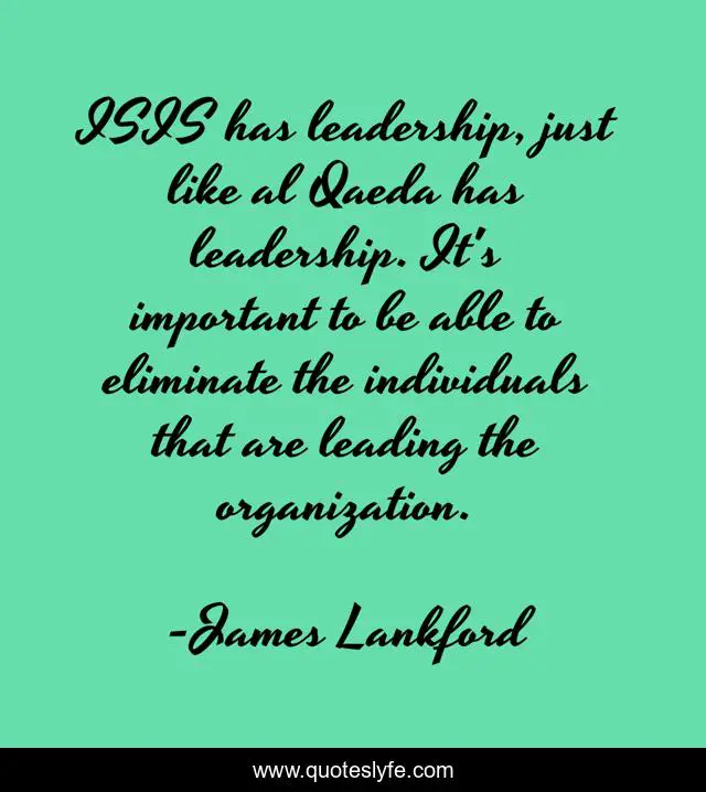 This page presents the quote "ISIS has leadership, just like al Qaeda has leadership. It's important to be able to eliminate the individuals that are leading the organization.". Author of this quote is James Lankford. This quote is about organization, important,.