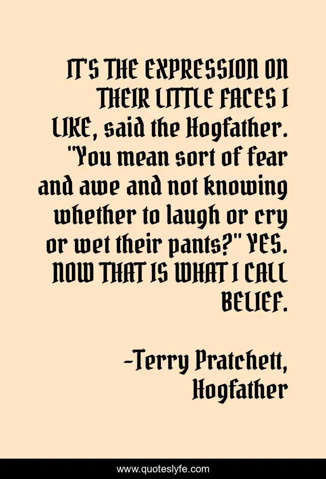 This page presents the quote "IT'S THE EXPRESSION ON THEIR LITTLE FACES I LIKE, said the Hogfather. "You mean sort of fear and awe and not knowing whether to laugh or cry or wet their pants?" YES. NOW THAT IS WHAT I CALL BELIEF.". Author of this quote is Terry Pratchett, Hogfather. .