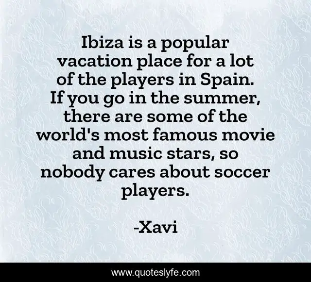 This page presents the quote "Ibiza is a popular vacation place for a lot of the players in Spain. If you go in the summer, there are some of the world's most famous movie and music stars, so nobody cares about soccer players.". Author of this quote is Xavi. This quote is about music, vacation, stars,.