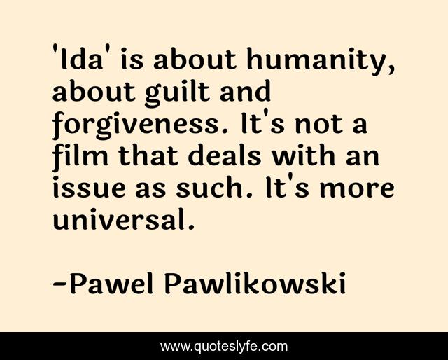 This page presents the quote "'Ida' is about humanity, about guilt and forgiveness. It's not a film that deals with an issue as such. It's more universal.". Author of this quote is Pawel Pawlikowski. This quote is about guilt, humanity, film,.