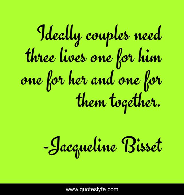 This page presents the quote "Ideally couples need three lives one for him one for her and one for them together.". Author of this quote is Jacqueline Bisset. .
