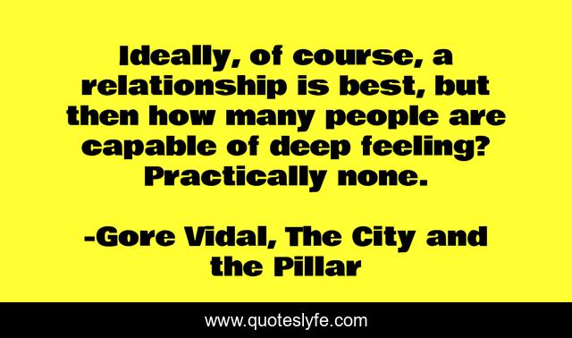 This page presents the quote "Ideally, of course, a relationship is best, but then how many people are capable of deep feeling? Practically none.". Author of this quote is Gore Vidal, The City and the Pillar. .