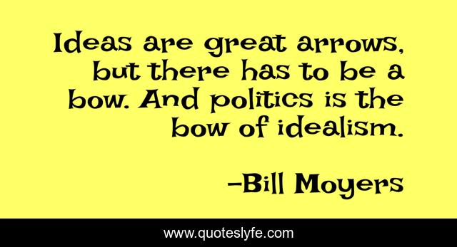 This page presents the quote "Ideas are great arrows, but there has to be a bow. And politics is the bow of idealism.". Author of this quote is Bill Moyers. This quote is about idealism, great, ideas,.