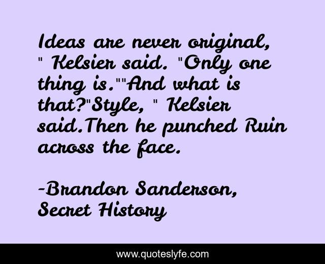 This page presents the quote "Ideas are never original, " Kelsier said. "Only one thing is.""And what is that?"Style, " Kelsier said.Then he punched Ruin across the face.". Author of this quote is Brandon Sanderson, Secret History. This quote is about behaviour, attitude, style, bravado,.