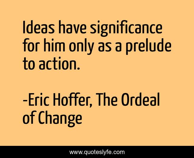 This page presents the quote "Ideas have significance for him only as a prelude to action.". Author of this quote is Eric Hoffer, The Ordeal of Change. This quote is about action, ideas,.