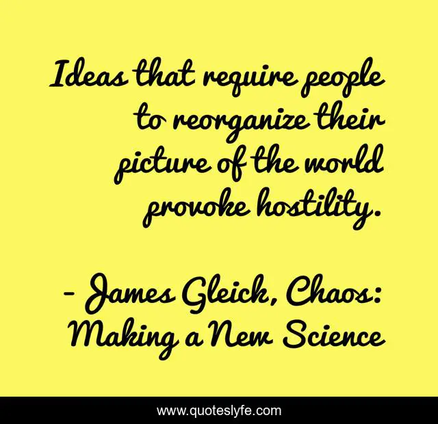 This page presents the quote "Ideas that require people to reorganize their picture of the world provoke hostility.". Author of this quote is James Gleick, Chaos: Making a New Science. This quote is about life, paradigm-shift, thomas-kuhn, science, philosophy, chaos, chaos-theory, mathematics, paradigm,.