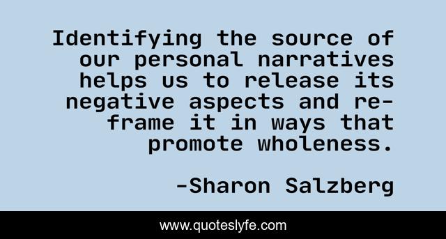 This page presents the quote "Identifying the source of our personal narratives helps us to release its negative aspects and re-frame it in ways that promote wholeness.". Author of this quote is Sharon Salzberg. This quote is about relationships, love, storytelling, communication, buddhism, meditation, affection,.
