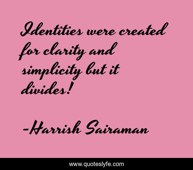 This page presents the quote "Identities were created for clarity and simplicity but it divides!". Author of this quote is Harrish Sairaman. This quote is about division, clarity, dividing, identity,.