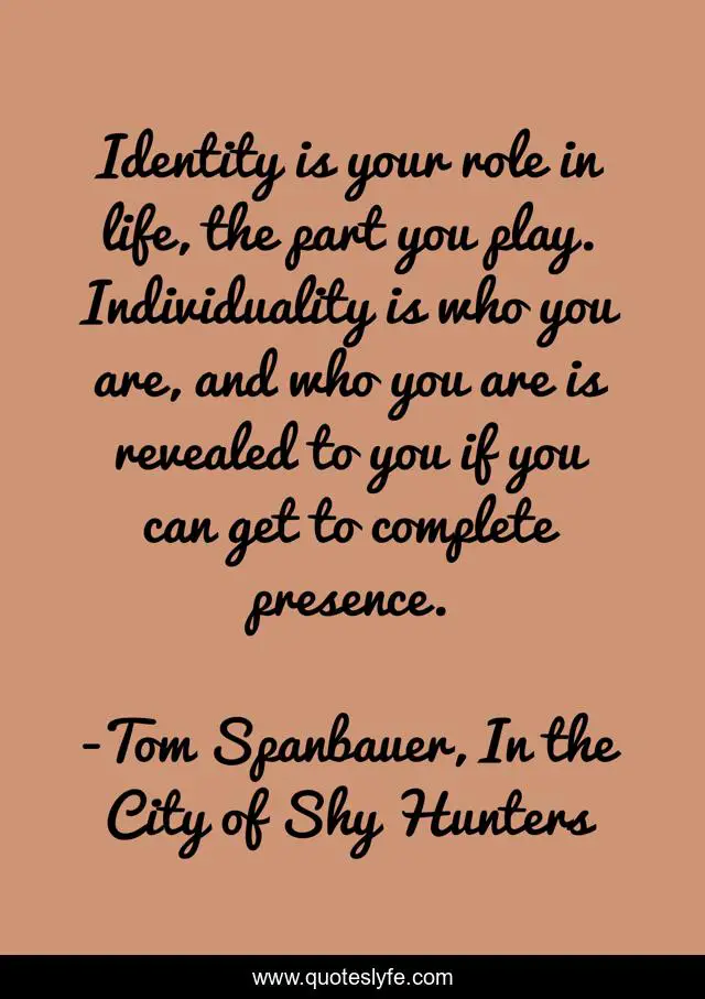 This page presents the quote "Identity is your role in life, the part you play. Individuality is who you are, and who you are is revealed to you if you can get to complete presence.". Author of this quote is Tom Spanbauer, In the City of Shy Hunters. This quote is about individuality, identity,.